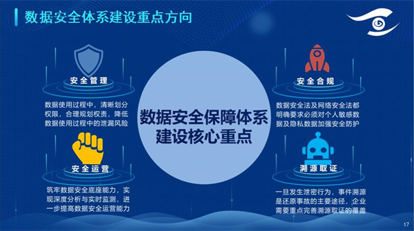 「數據是城市化數字轉型的核心,大家有沒有想過一個問題,數據一直存在,以前為何沒有體現出這麼大的價值呢?因為以前大家都把數據放在自己家裏不捨得給別人,靜止的數據只能成為數據孤島,隨着今天數字政府以及數字城市的快速發展,我們讓數據充分的流動起來,讓數據來驅動我們城市治理、商業價值變現以及合法合規的開發共享,只有這樣才能讓數據體現出其真正的價值。」論壇中,深圳觀安副總經理、上海觀安數字政府事業部總經理鄔建偉以《城市數碼化轉型中的數據安全保障體系建設》為題,圍繞城市數碼化轉型為大家深入解讀我國數字城市數據安全保障體系建設工作的主要開展方式和思路。