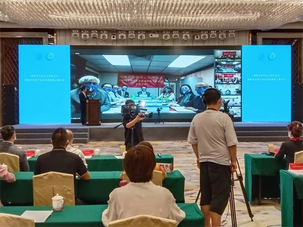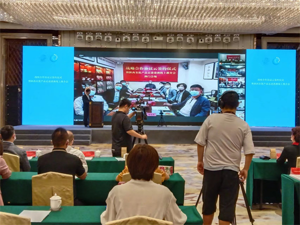 5月18日,陝西省貿促會、陝西國際商會在西安舉辦陝西名優產品走進港澳線上推介會暨戰略合作協議雲簽約儀式。會議同時在西安、香港、澳門三地設立分會場,採用線下和線上相結合的方式召開。陝西省貿促會(陝西國際商會)會長馬玉紅和香港驪山有限公司總經理張豐在線簽訂合作協議。