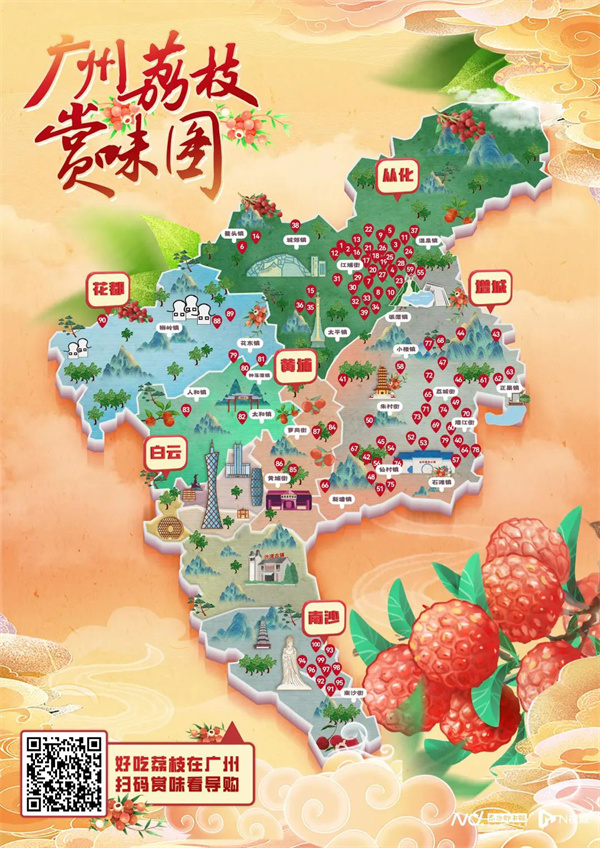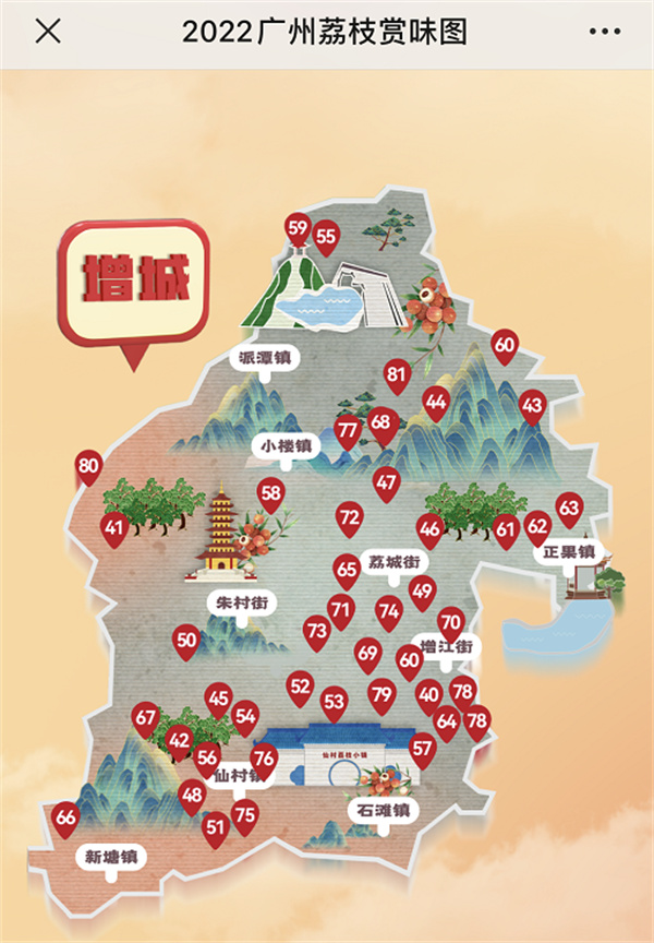 啟動會上,廣州市農業農村局發佈了2022年廣州荔枝賞味圖,涵蓋了廣州各荔枝產區,對外開放採摘的主要荔枝種植企業。其中,增城共有39家果園,採購商和消費者只需掃二維碼即可登錄廣州荔枝賞味圖的移動端版,果園的地址、荔枝品種、產量、採摘時間和聯繫方式等信息,皆可在地圖上查看。(記者 頼小青 通訊員 穗增宣)