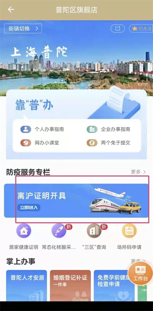 疫情期間,普陀全程網辦零接觸,將「離滬證明」的諮詢、申請、開具、審批、領證等環節放在隨申辦全程網辦,有效減少申請人與居民區、街鎮工作人員直接接觸,降低疫情傳播的風險,同時亦為忙碌在抗疫一線基層減負,方便群眾辦理。將離滬申請人可能採用的駕駛機動車出行和乘坐公共交通出行的情形全部進行覆蓋,按照《駕駛機動車離滬人員憑證證明工作指引》條件、流程等應用到公共交通出行。由區府辦、街鎮和行政服務中心三方發力,第一時間組團解決技術、業務、協調問題,實現功能服務覆蓋全面。