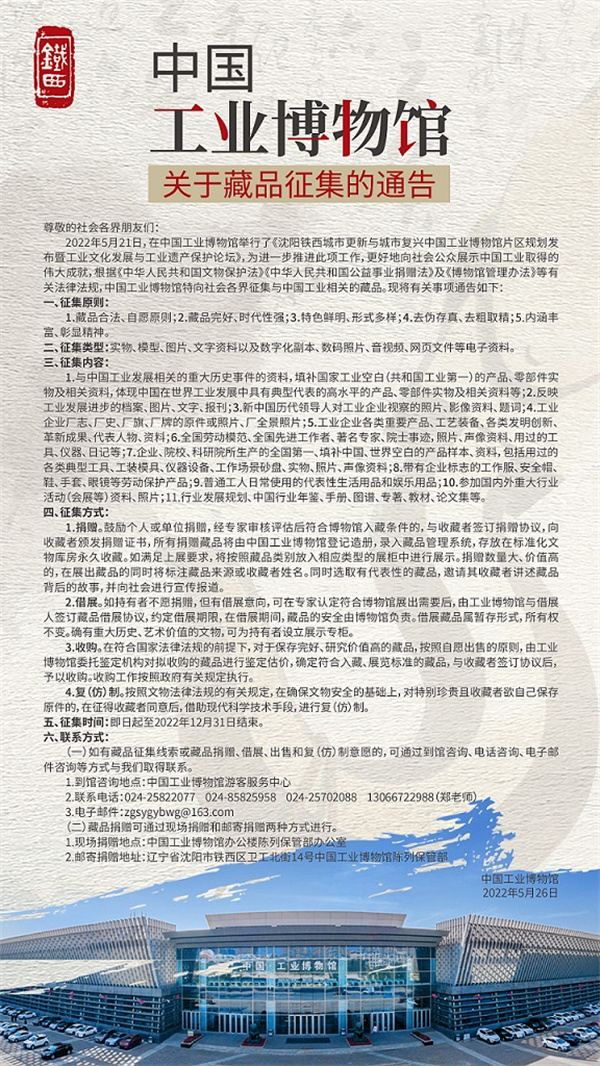 5月26日,瀋陽鐵西區發佈《中國工業博物館關於藏品徵集的通告》,從即日起至12月31日,面向全社會徵集藏品。