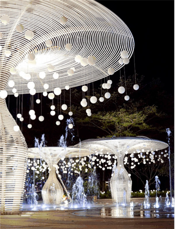 以大型裝置導入編程技術,構建全景式光影體系。大型水霧互動裝置「時空邊界」通過動態輸入技術,將信息及動態視頻以縹緲的水霧和光影的形式勾勒出輪廓。聲光互動裝置「52赫茲的鯨」導入實時環境音效,用光的線條勾勒出了聲音的波長和歡樂的形狀。