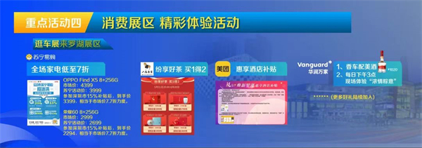 本次車展期間的汽車促消費活動,羅湖區將根據個人消費者購買單輛汽車的裸車價(發票以「不含稅價」下同)分為四檔經費補貼。第一檔:10萬元以上25萬元(不含)以下每輛補貼5000元;第二檔:25萬元以上50萬元(不含)以下每輛補貼1萬元;第三檔:50萬元以上80萬元(不含)以下每輛補貼1.5萬元;第四檔:80萬元以上每輛補貼2萬元。同時,對活動期間在參與羅湖區活動企業處購買新車,且在羅湖區內重點保險企業購買車險的個人消費者,按其商業險金額給予補貼,每位消費者最高補貼5000元。
