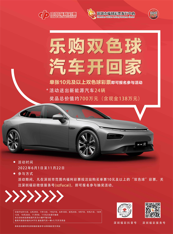 記者從深圳福彩了解到,為回饋深圳彩民對福彩雙色球遊戲的支持,深圳福彩將送出24輛汽車。2022年6月1日起,凡在深圳市範圍內福利彩票投注站購買單張10元及以上的「雙色球」彩票,關注深圳福彩微信服務號(szfucai),即可報名參與抽獎活動,贏取新能源汽車和現金大獎!