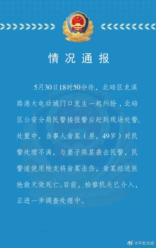 據通報,5月30日18時50分許,北碚區龍溪路港大電動城門口發生一起糾紛,北碚區公安分局民警接報警後趕到現場處警。