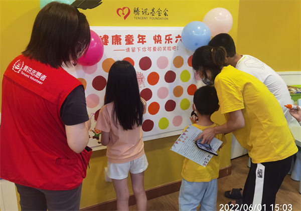 除了社工姐姐哥哥們精心設計“健康打卡樂”,深圳市兒童醫院10個Vcare關愛空間有超過十種的互動活動融合其中,充分讓兒童們感受到快樂,他們才是這一天的主角。記者在現場看到,小朋友在家長陪同下自覺遵守,第一步先到六一笑臉牆簽下大大笑臉,開啟今天六一快樂之旅,提交主題繪畫卡、獲取健康能量卡、參與空間現場的互動遊戲——有的空間是攜手臨床醫護人員以“奇妙小丑醫生”迎接六一的到來,醫護人員肩膀掛上各種動物、掛上紅鼻子等,通過精心打扮一番後,進入病房查房,在查房後從白大褂八寶袋裏面變出小禮物或表演魔術給孩子們道上六一祝福;有的空間是開展“快樂時光機”活動,邀請志願者分享他們童年快樂清單、準備他們那個時代遊戲和玩具分享給患兒、通過紙飛機寄語寫下對孩子的祝福;有的空間回答健康卡片的內容,通過積分,獲得抽取盲盒的機會;有的空間是自由組隊,分工合作完成健康拼圖;有的空間是健康攤位遊戲,通過完成遊戲任務獲得健康能量卡片;有的空間是遊園遊戲:好食物運輸員、好習慣與壞習慣要區分等遊戲。