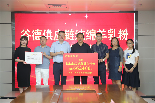 谷德供應鏈有限公司向河南省慈善總會捐贈價值66.24萬元純綿羊乳粉5520罐,為郟縣兒童中心等7家兒童福利機構的552名困境兒童送去節日祝福和溫暖。河南省政協原秘書長、河南省慈善總會副會長王樹山,谷德供應鏈有限公司總裁李楠,王氏嚴選商貿集團有限公司總裁趙帥猛,新中盟健康產業集團董事會秘書長劉厚民等領導出席捐贈儀式,共同見證愛的力量。