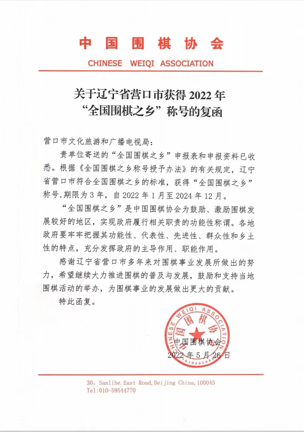 記者從營口市委宣傳部獲悉,2022年經營口市文化旅遊和廣播電視局申請,中國圍棋協會經過審核和公示,授予營口2022年「全國圍棋之鄉」稱號。成為全國17個獲評地區之一,也是遼寧省唯一獲得此稱號的城市。