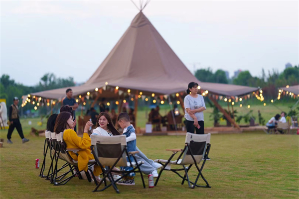 可以是自在閒逸的:林間、湖邊,在天幕下或者帳篷里和朋友喝酒、吃燒烤、聊天,還可以玩飛盤、垂釣,暫別日常生活工作空間,與大自然來一場親密接觸,隨着露營在成都的熱度逐漸攀升,位於錦江區的天際線自然營成為很多市民的選擇。