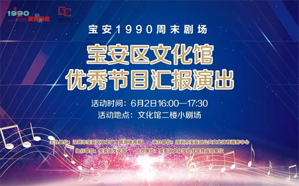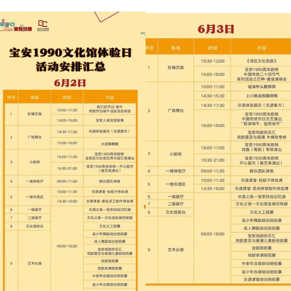 為了更好的滿足人民群眾日益增長的文化藝術需求,提高全民藝術素養,讓藝術融入到普通群眾的生活中去,更好的打造品牌特色文化活動,由深圳市寶安區文化廣電旅遊體育局主辦,深圳市寶安區公共文化體育服務中心承辦,寶安區文化館執行的「我們的節日」寶安1990文化館體驗日活動,將於6月2日-3日在「寶安1990」舉行。