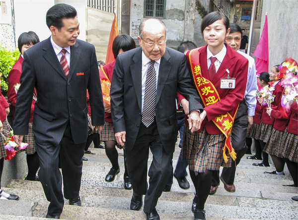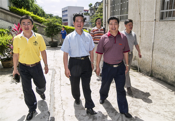 林躍文(左1)陪香港著名僑領陳偉南先生(左2)參觀校園
