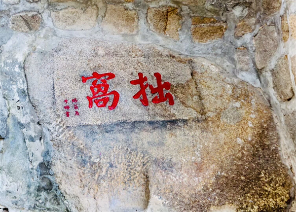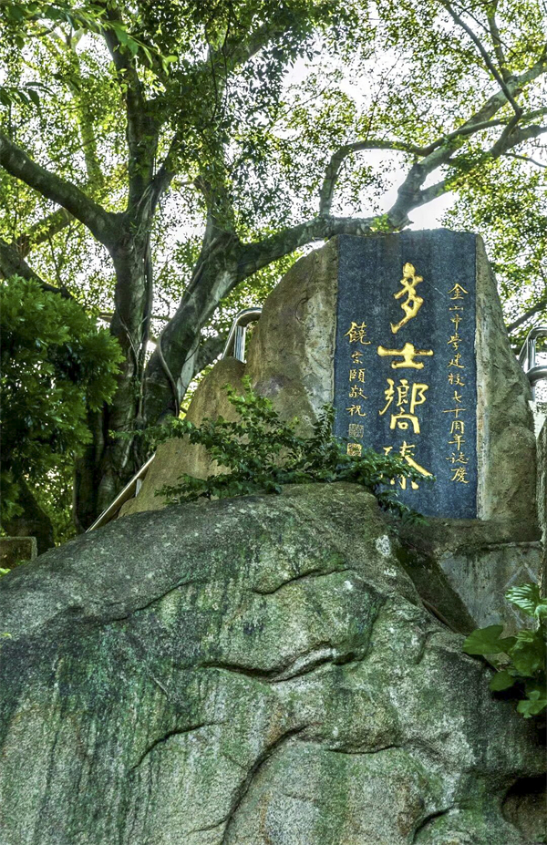林躍文帶我來到位於金山西南山腰,摩崖石刻最為集中之處的平台。他指着石壁最上面呈長方形石刻-----「多士向臻」說,這是1996年金山建校七十周年,國學大師饒宗頤書寫的賀詞。 「多士」是指眾多之士。金山是讀書人仰慕、嚮往的地方。熱切的求學者漫步書山,暢遊學海,探索不止。這裏既有辛勤的播火者,又有熱切的求學者,勤教樂學,教學相長,實乃「多士向臻」也。
