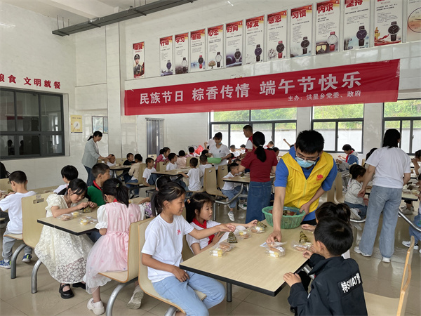 在洪星鄉新時代文明實踐所,洪星鄉組織映山紅志願服務隊志願者製作粽子,並前往校園、養老院、衛生院等場所,為獨居老人、留守兒童、醫護人員等送去端午慰問。