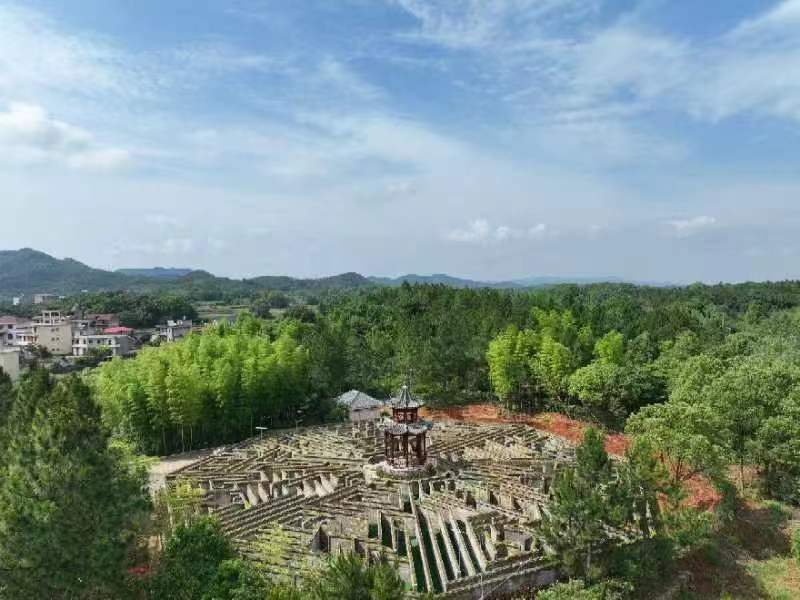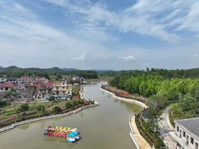 走進嶺東社區村口牌坊,道路兩旁50畝月季園花開,紅、白、綠相間,遊步道在花草間蜿蜒曲折,姑娘們在棧道觀景台拍照,留下美麗的倩影。村旁鄒公塘清水盪漾,微風習習,遊客踩着遊船湖上嬉戲;一座八卦迷宮掩映在翠竹林間。