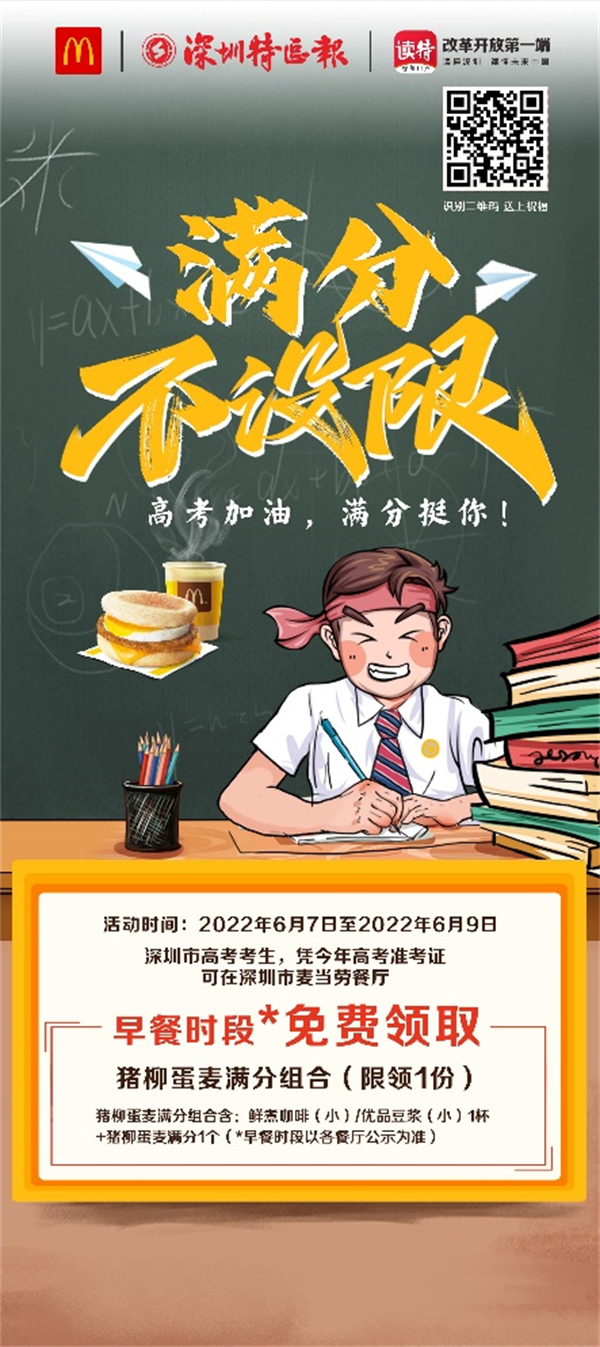 麥當勞深圳市場總經理陳影宏表示,這屆高三學子註定了不平凡,但特殊人生經歷帶來的人生體驗,其價值意義與高考同樣重要。追求心之所向,綻放考場內外的無限可能。作為社區的一分子,我們希望通過實際行動積極踐行“因為熱愛,盡善而行”的品牌理念。在7-9號高考期間的早餐時段,為所有深圳高考考生送出免費“滿分”早餐,希望考生們以元氣滿滿的狀態,取得滿分成績,迎接滿分未來,加油!