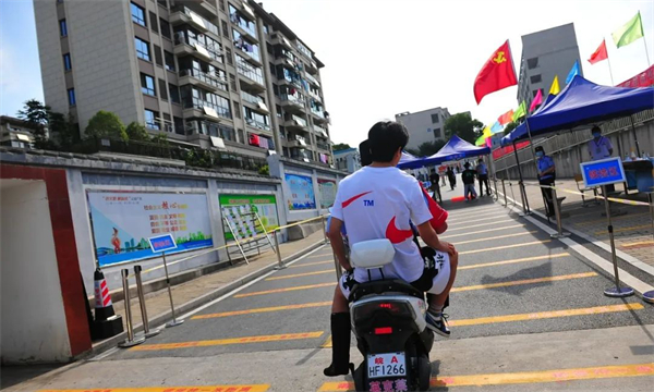 扶着小明上了電動車,黃雪晨快速通過門禁,再駛上100多米長的坡道,來到考場樓下。黃雪晨背扶着小明,慢慢跨上一級又一級台階。在監考老師的引導下,黃雪晨很快找到小明的考場,輕輕地將其放下,再扶着他坐到位子上。「考試結束後,在位子上別動,等我來接你。祝考試順利!」一番叮囑後,黃雪晨才放心地離開。
