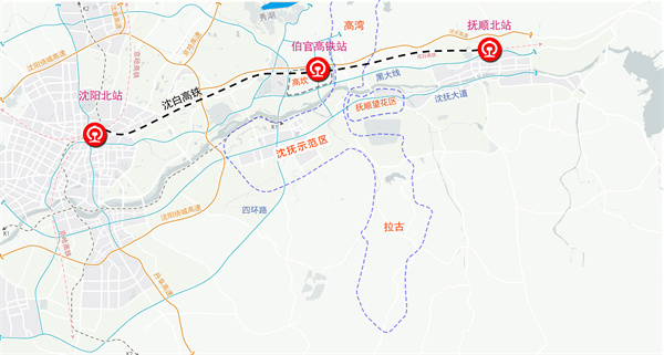 沈白高鐵瀋陽北站至撫順北站間增設伯官站線路示意