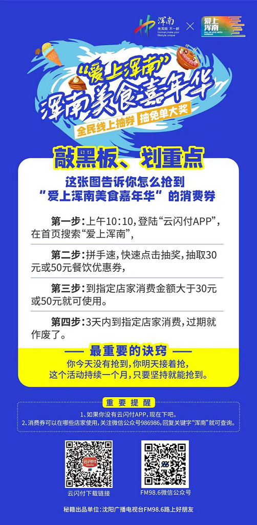 「每天線上可搶30元、50元不等的通用券,每天10個500元免單大獎等你來」。6月9日——7月9日,由渾南區政府主辦,渾南區工商聯、渾南區商務局、渾南區餐飲商會承辦的「愛上渾南」美食嘉年華主題活動全面開啟,渾南區政府的消費補貼疊加餐飲商家的消費補貼,總消費補貼近千萬。廣大市民在渾南盡享美食的同時將有可能抽取到免單500元的驚喜大獎。