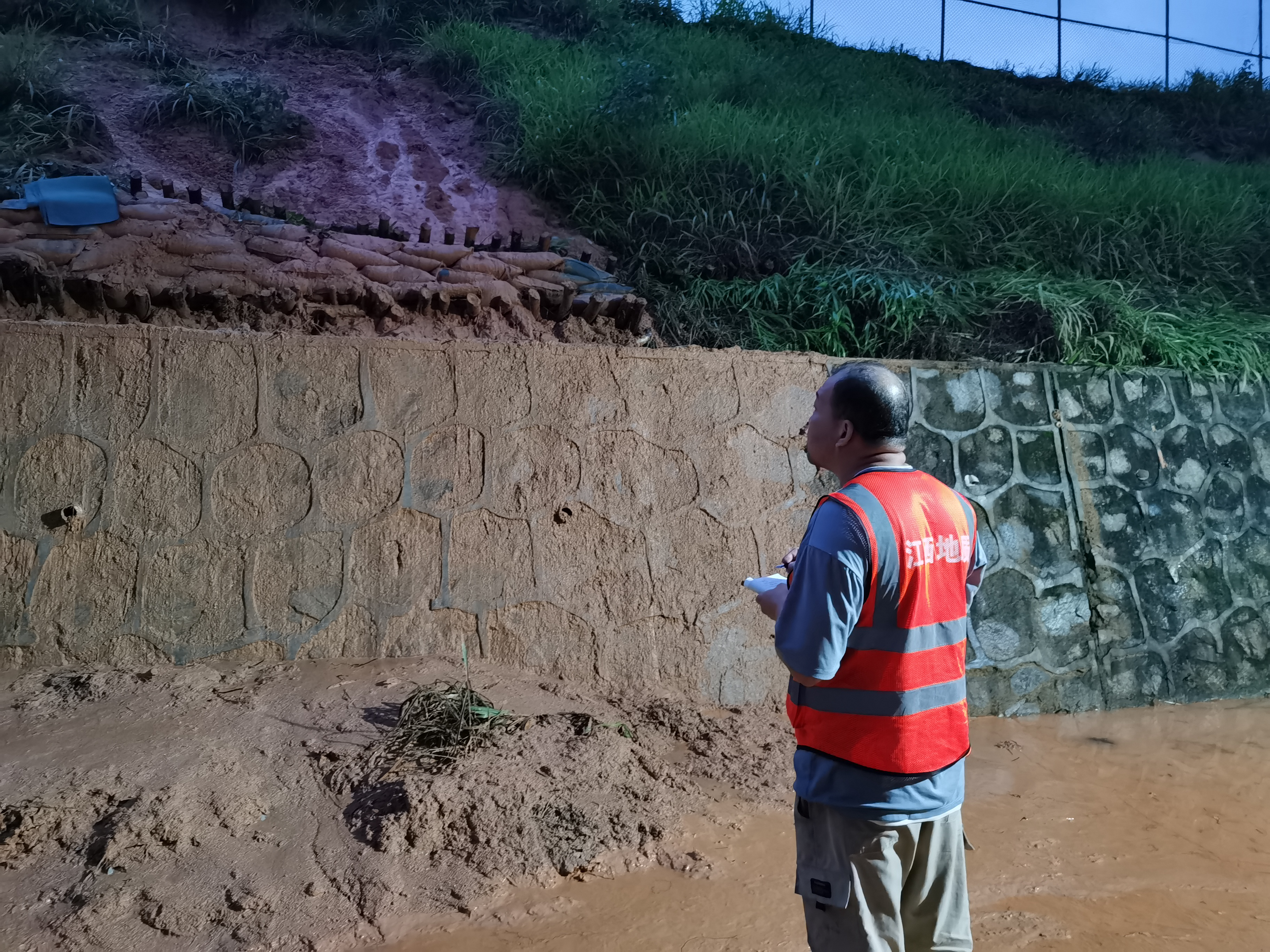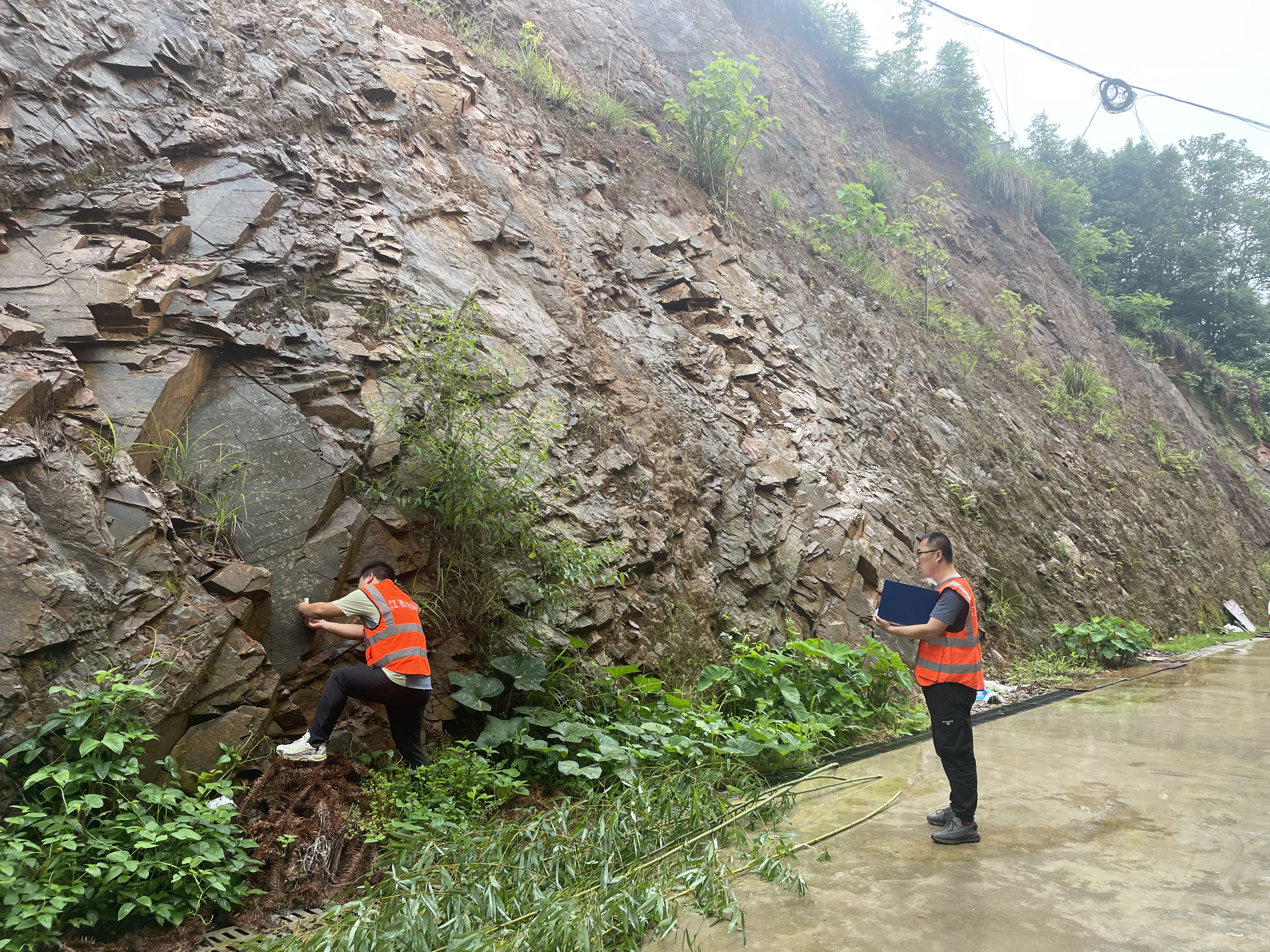 大隊連夜派出江西省地質環境調查研究院3名技術人員,迅速趕往瑞金市地質災害一線現場,及時對謝坊鎮安背村小河背小組劉惟煌屋後滑坡隱患點進行險情判斷,提出處理措施,並聯合當地自然資源局工作人員深入居民家中,提醒大家密切關注雨情,嚴加防範地質風險。
