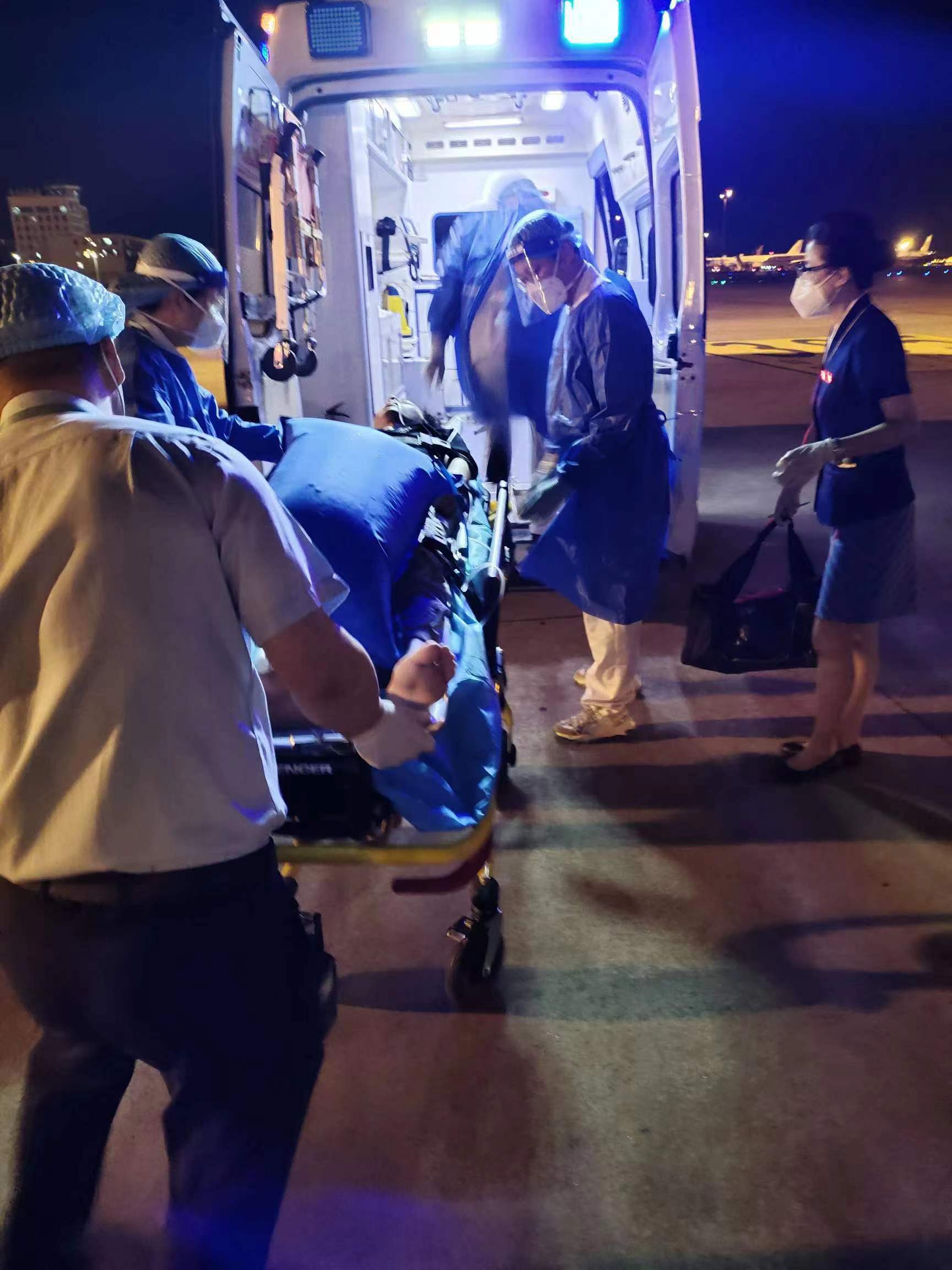 20:55,飛機落地杭州。地面保障小組、機組成員與熱心旅客一起,僅用10分鐘就將旅客由機上順利送上救護車,隨後送往急救中心。