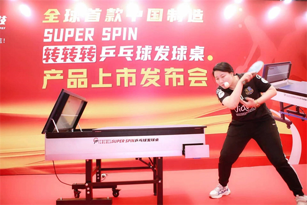 無需撿球、可摺疊、可測球速、可測球轉速等等,日前,由深圳市敏高科技體育用品有限公司東莞分公司舉辦的全球首款中國製造Super Spin轉轉轉乒乓球發球桌產品上市發佈會在東莞舉行。據介紹,該款發球桌有無需人工撿球、可測球旋轉速等12項功能,發明者是資深乒乓球運動愛好者,球桌發佈現場亦吸引眾多商家關注。