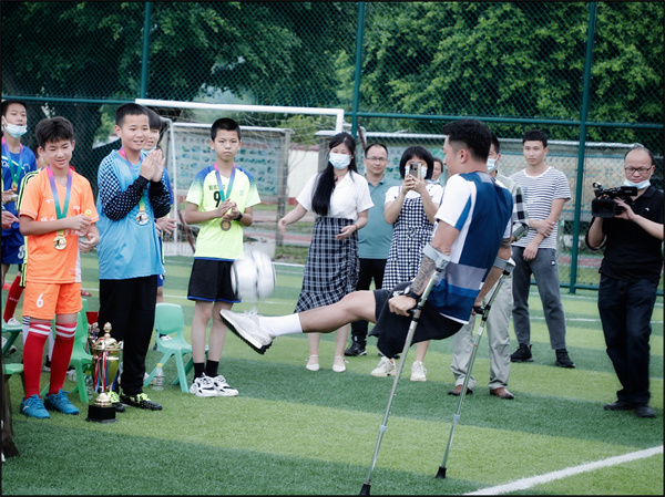 黃水平校長、吳周琴書記、鍾成文校長代表校方接受了捐贈並回贈錦旗感謝各方代表。彭道堅候任會長親手為最佳射手黃星源同學頒發了「金球靴」獎盃和獎金。董良田局長、戴同鑫前會長、黃勇候任隊長為黃兵、黃達、黃志來頒發了最佳教練獎金。作為本次足球助學活動的勵志愛心大使,「神奇小子」——獨腿球王殘疾人運動員何憶義現場為孩子們做了勵志演講,講述了自己如何從一個在深圳足球預備隊被球探看中準備送去法國深造的時刻突發骨癌後左腿高位截肢的痛苦境遇中自強不息與命運抗爭,最終又憑藉自己的堅強意志刻苦訓練重回綠茵場並實現自己人生夢想的真實勵志故事。