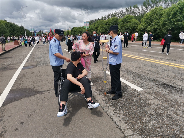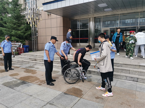當日,在伊春市一中考點警戒線外出現一位拄拐的特別考生,該考生家長向治安大隊民警求助,經了解這位考生在考試前一天不慎將腿摔傷,又因當天下雨路面濕滑,加上初次使用拐杖,自己進入考場會有再次摔傷風險,但是家長無法陪同進考場,心情十分焦急。治安大隊民警得知此情況後馬上與考點負責人溝通,並開通「綠色通道」,民警將此考生從校外警衛點安全送到考場,並在考試結束前將家長準備的輪椅送到考場門口,待考試結束後將考生推出考點,安全送到家長手中。治安大隊民警周密的安排讓萬分焦慮的考生家長感動不已。當看到兒子坐在輪椅上被民警順利送出考場時,她激動的拉住警官的手:「你們真是個大好人啊,有事還得找警察!」