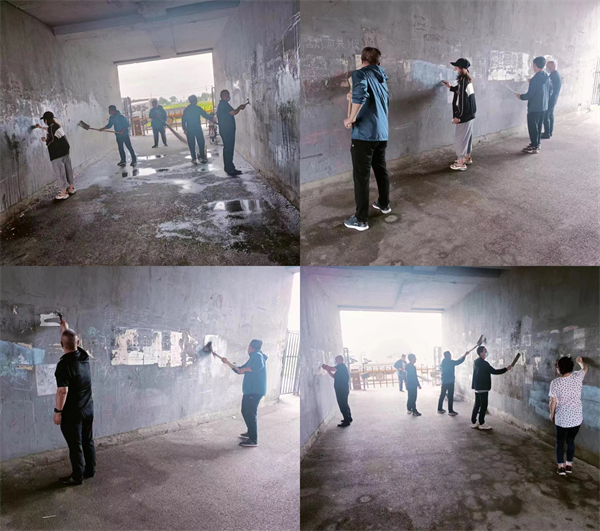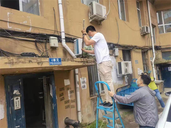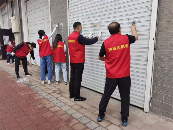 全區機關幹部放棄休息時間,一大早就來到各自點位行動起來。他們頂着風雨,手拿編織袋、手持掃帚或鐵鍬,對路面和樓道內的垃圾進行清理,碎小的紙屑垃圾掃不起來,他們直接用手就撿起來。對於牆面的小廣告,他們一點點的拿鏟子鏟掉,使用梯子攀爬清理高處的小廣告。有些膠水粘的太牢固,鏟不下來,他們沒有放棄,用噴壺噴濕或用濕巾來擦拭,清理下來後,再用塗料噴刷,牆面又恢復乾淨如新。