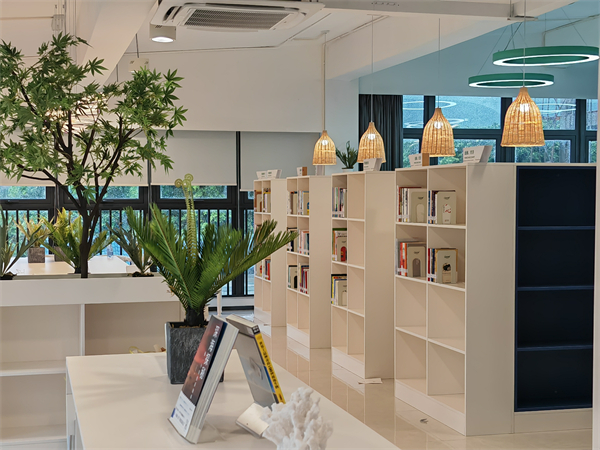分館周邊山海環繞,環境宜人。為切合本地自然風貌特色,分館整體設計以白色調為主,搭配藍色點綴,在標識導引、家具、燈具及裝飾上全面融入本地漁村特色元素,構建了一個獨具風格的海洋文化特色閱讀空間。標識導引中的海浪波紋、船型服務台、船形書架以及面朝大海的閱讀座位,處處都散發着海的味道。