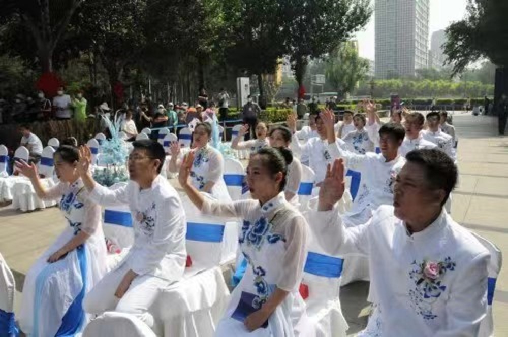 6月26日上午8點58分,在春歸夏轉之際,瀋陽市皇姑區民政局在英雄公園隆重舉行「丹青頌英雄,紅羅織嫁衣——禮敬城市英雄,牽手濃情夏日」集體婚禮,9對抗疫英雄情侶在親朋好友的見證下,攜手走進婚姻殿堂,深情宣誓相扶相依。