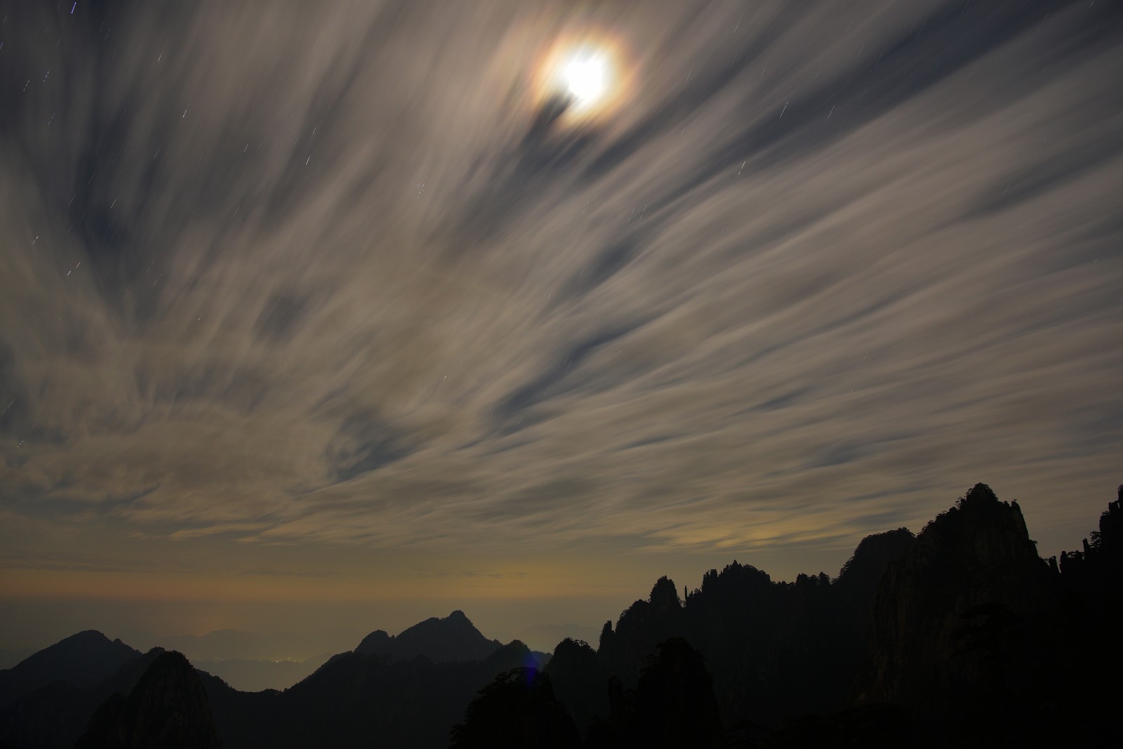 當月亮懸掛在海拔1800米的黃山之巔夜空時,這份靜謐的驚艷與在城市上空欣賞到的是不同的。11月8日夜,絲絲淡雲,巍巍青山,被月光透射出幽幽亮彩的同時,又烘托出了黃山風景區「明月松間照」的絕佳意境。