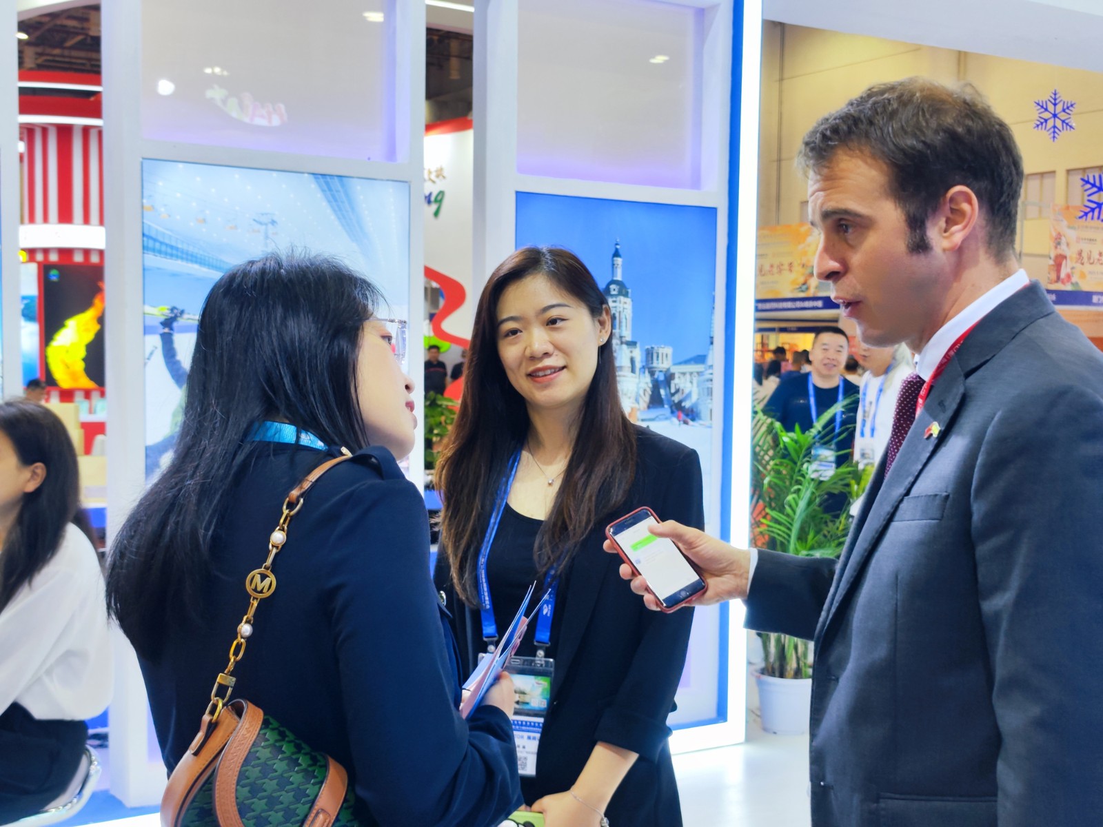 展會現場,龍江展位熱鬧非凡,現場觀眾絡繹不絕地前來參觀。觀眾們在展位前停留的時間較長,細細品味着展示的內容,並用手機進行記錄和分享。他們紛紛掃碼關注我廳的微信公眾號、抖音視頻號等平台,迫不及待地想要獲取更多的信息。領取黑龍江省特色宣傳品和紀念品,讓現場氛圍更加熱烈。各市(地)參會代表現場向公眾發放宣傳資料,展示具有地方特色的旅遊宣傳品、紀念品、文創工藝品和地方特色美食等,哈爾濱紅腸、黑河五大連池礦泉水及礦泉系列產品、老昌號冰花陶瓷、魚皮手工藝品等產品備受現場觀眾的矚目和喜愛。各隨團參展單位現場進行了洽談和對接,尋求進一步合作。
