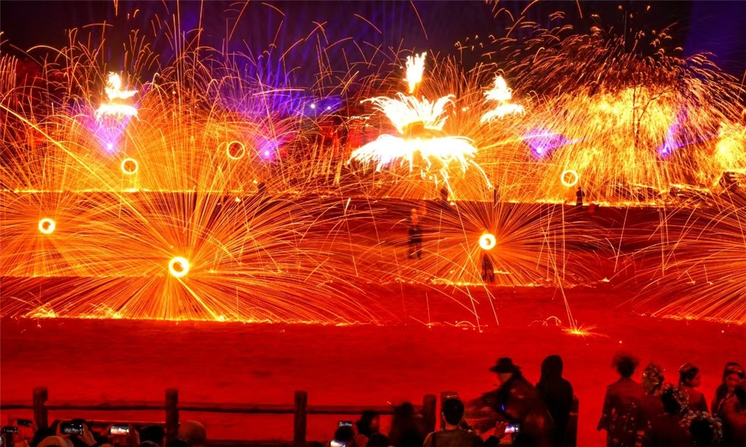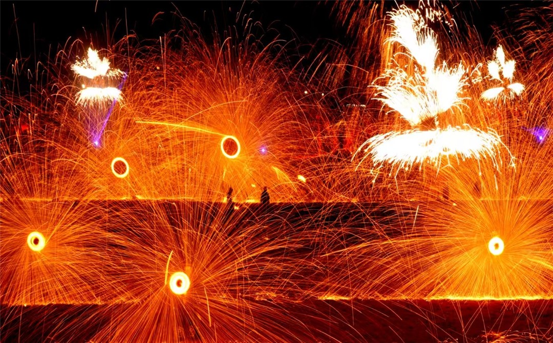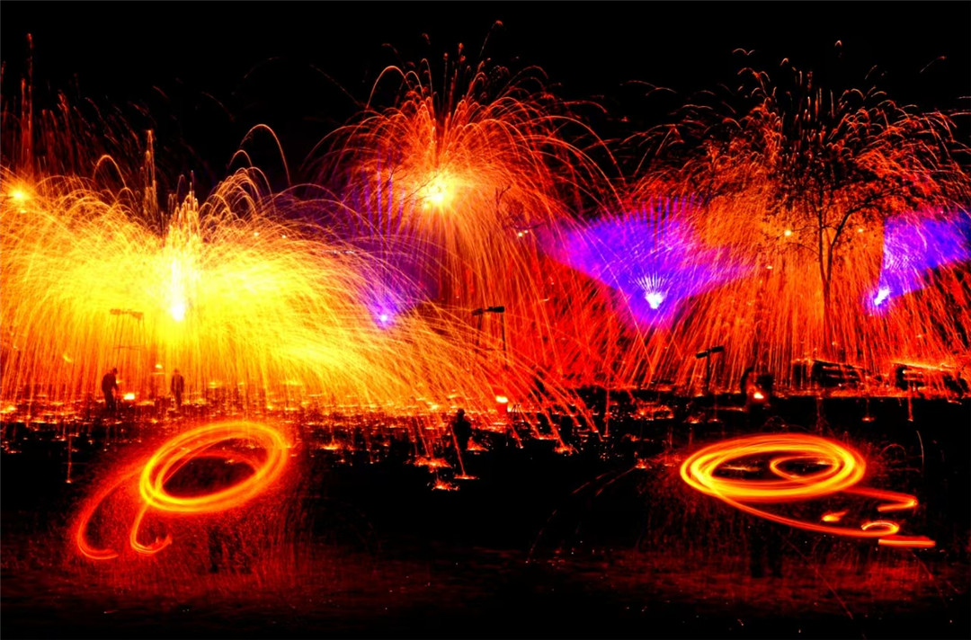 2月9日晚,民間藝人在河南省開封市萬歲山公園進行非遺打鐵花表演,喜迎2025年元宵佳節。