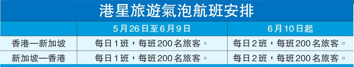 疫情之下,不少港人對出外旅遊望穿秋水。商務及經濟發展局局長邱騰華昨日公布:本港與新加坡的「航空旅遊氣泡」將於5月26日重啟,除要求旅客在出發前14天沒有外遊紀錄外,新增要求是新加坡來港的「氣泡」旅客要安裝及使用「安心出行」,並在離港後保留相關紀錄31天;「氣泡」初階段的5月26日至6月9日,往返兩地每日各一班航班,每班機最多容納200位旅客。另外,公務員事務局局長聶德權宣布,「回港易」安排將擴大至內地其他省市,其他陸路口岸配額如常外,新增香港國際機場配額每日1000個。