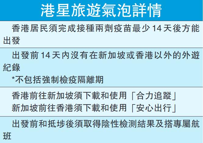 他續指,因應疫情最新發展,包括變種病毒的出現和較長的潛伏期,兩地認為有必要在原有安排下,循四方面加強保障。首先是嚴守出發前無外遊紀錄,原本安排已規定「氣泡」旅客要在出發前14天內沒有到新加坡或香港以外的外遊紀錄,但如果旅客在這段時間前曾因外遊而要在返回新加坡或香港後隔離,則要完全滿足隔離期後,再計算14天。