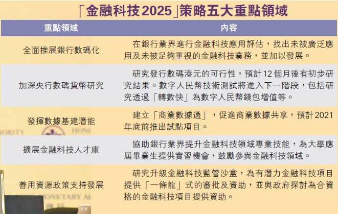 「金融科技2025」策略主要包括五大重點領域,分別是全面推展銀行數碼化;加深央行數碼貨幣研究;發揮數據基建潛能;擴展金融科技人才庫,以及善用資源政策支持發展。