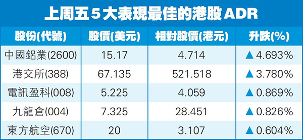 上周五港股美國預託證券ADR亦普遍下跌,比例指數下跌0.88%,ADR港股收報27759點,較港股上周五收市低245點。控(005)、中石油(857)、中石化(386)、國壽(2628)、騰訊(700)、阿里巴巴(9988)、美團(3690)ADR收市價均較本港收市跌逾1%。恒指夜期上周五下跌0.86%,跌穿兩萬八,收報27780點,跌224點。