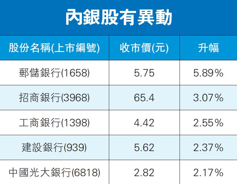 內銀股亦向好,其中郵儲銀行(1658)漲5.9%報5.75元;招商銀行(3968)亦升3.1%,收報65.4元。不過,大型科網股普遍下跌,小米(1810)跌超2%,京東(9618)跌超1%。