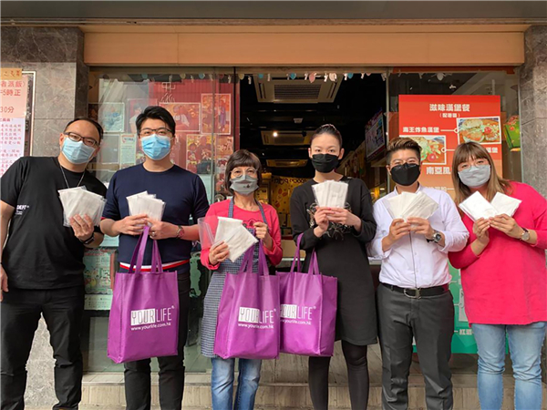 優樂生活行政總裁魏擁天(左二)、行政經理陳可欣(右二)帶領一眾同事向社區基層有需要人士派發口罩等防疫用品。
