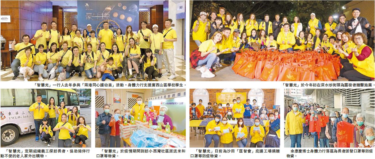 自協會成立以來,「智慧光」一直本着積福積德、普渡眾生的精神,帶領信徒一起參與和籌辦了多項有意義的公益活動,包括社會福利、健康醫療和生命教育等相關的慈善項目。在社會福利上,「智慧光」積極參與社區服務,尤其關注弱勢群體的切實需要,除了成立三年間為基層市民送出3萬多個愛心飯盒外,又參與舉辦各類型敬老午宴活動,更定期組織義工到各長者護理中心探訪長者,又協助陪伴行動不便的老人家外出購物,為他們送上歡樂與關懷,助其融入社區;在健康醫療方面,協會認為醫療是改善人類生活質素、推動社會發展的重要元素之一,為了讓貧苦大眾也能接受醫療服務,「智慧光」於今年初聯同「榕光社」及「明歌知欽」舉辦流動醫療車免費中醫服務,捐贈藥粉藥劑,在深水埗街頭為露宿者贈醫施藥;在生命教育的層面上,協會於去年參與「兩港同心護幼苗」活動,身體力行支援廣西山區學校學生,資助裝配電熱水爐設備,避免了住校學生因生火燒水洗澡,以及搬運熱水到宿舍而發生燙傷、滑倒等意外,讓他們可以在安全安心環境下投入學習生活。而於疫情爆發初期,本港防疫物資嚴重短缺,有見及此,「智慧光」師父及弟子紛紛四出搜購口罩援助長者及基層市民,並組織義工隊到觀塘、荃灣、西環及小西灣派發抗疫口罩及愛心福袋,又為「肝康會」及「匡智會」庇護工場捐贈口罩等防疫物資,期間合共捐出超過5萬個口罩,真正地將佛教中的「布施」精神落實於日常生活中。