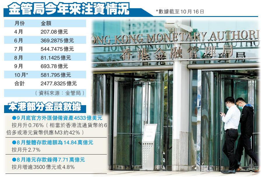 近月新股暢旺帶動港元,金管局10月公布最新貨幣統計數字,8月港元存款錄得7.71萬憶元,按月增逾3500億元或4.8%,按年更大增近8700億元。金管局稱,主要是由於新股認購活動所致,若撇除有關因素,月內港元存款按月仍增1.4%。