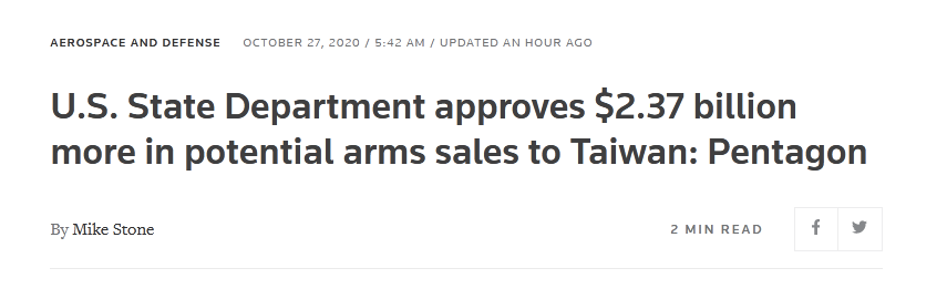 10月21日,美國國防部國防安全合作局發表聲明稱,美國務院已批准向台灣出售總額約18億美元的武器裝備,包括洛克希德·馬丁公司生產的「海馬斯」多管火箭炮系統、波音防務生產的SLAM-ER增程型空對地導彈、F-16戰機新型偵察吊艙等。《華爾街日報》26日稱,雷神公司因此次軍售的MS-110新式偵察吊艙被中國列入制裁名單。