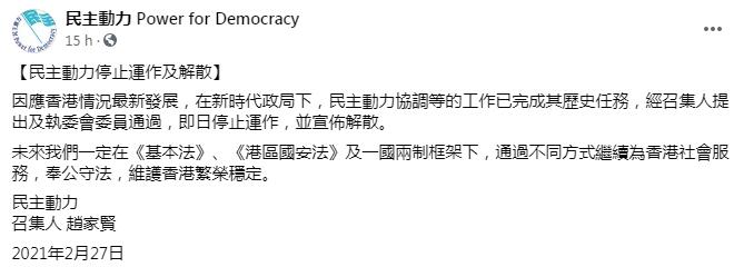 昨日(27日),香港「民主動力」在臉書宣布停止運作及解散。「民動」此前組織參與「協調」去年攬炒派違法「初選」,企圖奪取立法會過半數議席,從而達到顛覆政權的非法目的。