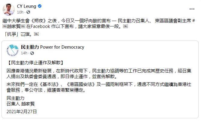 身兼「民主動力」召集人、東區區議會副主席的趙家賢,昨日(27日)發文宣稱,因應香港情況最新發展,「民主動力」協調等的工作已完成其歷史任務,因此他本人提出解散「民主動力」。他說,有關建議已獲執委會委員通過,「民主動力」由即日停止運作及解散。
