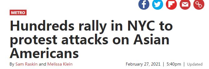 據美媒紐約郵報報道,數以百計的群眾昨日(27日)在紐約市內舉行集會,抗議紐約和美國國內其他地近期發生一連串針對亞洲裔人的暴力襲擊事件。