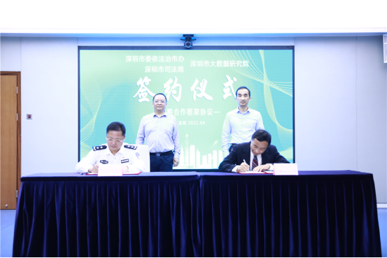 4月6日,深圳市委依法治市辦、深圳市司法局與深圳市大數據研究院舉行戰略合作協議簽署儀式。雙方將在依法治市和司法行政等領域的大數據開發與應用方面進行深入合作,實現數據清理、數據庫建設、數據分析與應用等無縫對接。