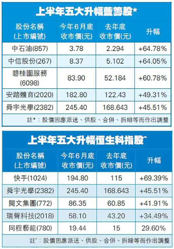 總結上半年,部分新晉藍籌股表現強勁,其中碧桂園服務(6098)升60.78%;不過3月「染藍」的海底撈(6862)卻跌逾30%,是表現最差成分股。上半年大宗商品價格及油價造好,中石油(857)及中信股份(267)分別升64.78%及64.05%。此外,手機設備股亦見升幅,瑞聲(2018)及舜宇(2382)分別累升34.49%和45.51%。