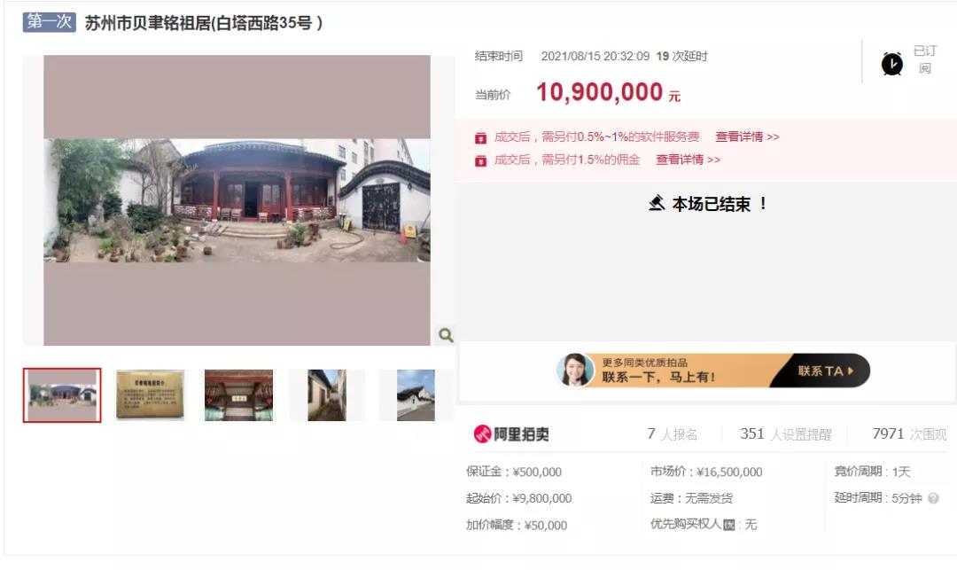 拍賣平台顯示,此次拍賣共有7人報名,351人設置提醒,8601次圍觀。在經過23輪競價後,最終以1090萬的價格成交,相比980萬的起拍價溢價110萬。