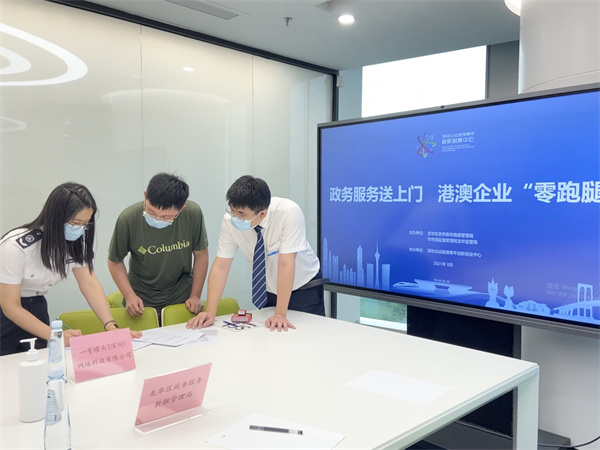 8月18日,深圳龍華區政務服務數據管理局會同龍華區委統戰部、區科技創新局、市場監督管理局龍華監管局在深圳北站港澳青年創新創業中心(以下簡稱「雙創中心」)開展「政務服務『送上門』,港澳企業『零跑腿』」活動,通過現場幫辦、上門培訓、綠色通道等方式,為入駐雙創中心的9家港澳企業提供「一對一、面對面」服務。