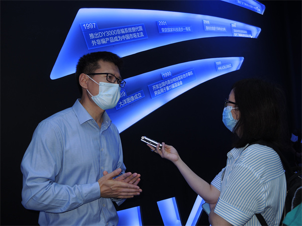 中科大洋市場部總經理劉雷鳴向記者介紹本屆服貿會展示亮點